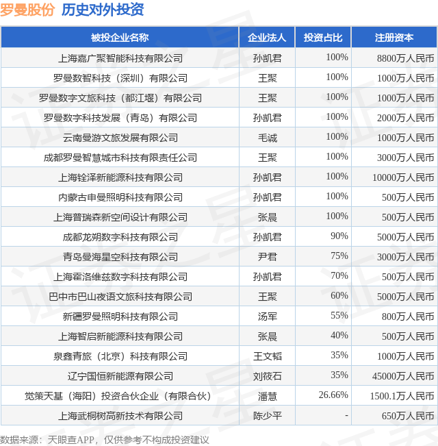 证券之星消息,根据天眼查APP显示,罗曼股份(605289.SH)新增一起对外投资事件,被投资公司为泉鑫青旅(北京)科技有限公司,法定代表人王文韬,投资占比为35%。该公司从事软件和信息技术服务业,注册资本为1000万人民币。目前,罗曼股份共存在对外投资19项,详见下表: