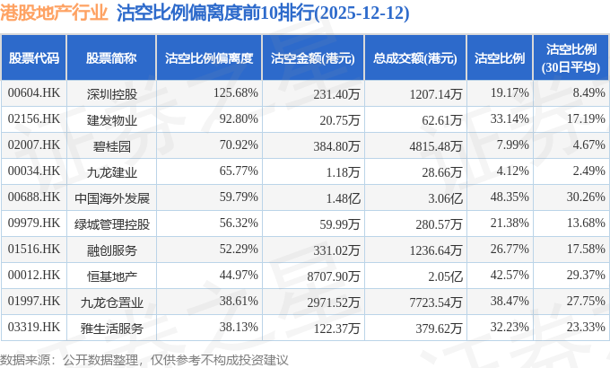 从沽空比例偏离度来看,深圳控股、建发物业、碧桂园沽空比例偏离度位居行业前三,分别为125.68%、92.8%、70.92%。