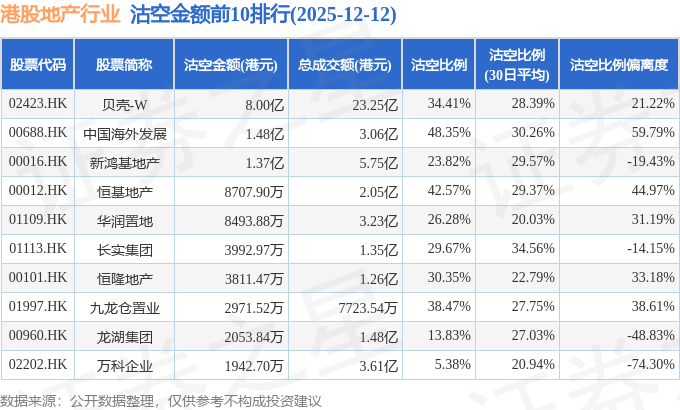 从沽空金额来看,贝壳-W、中国海外发展、新鸿基地产沽空金额位居行业前三,分别为8亿港元、1.48亿港元、1.37亿港元。