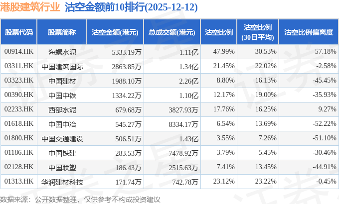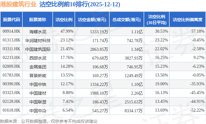 从沽空比例偏离度来看,海螺水泥、西部水泥、晋景新能沽空比例偏离度位居行业前三,分别为57.18%、9.27%、-0.05%。