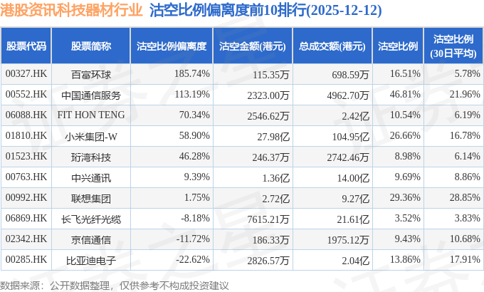 从沽空比例偏离度来看,百富环球、中国通信服务、FIT HON TENG沽空比例偏离度位居行业前三,分别为185.74%、113.19%、70.34%。