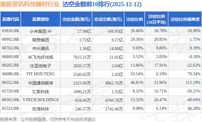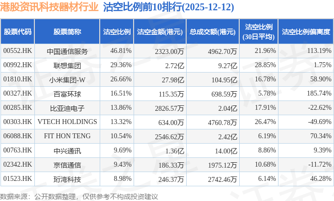 从沽空比例来看,中国通信服务、联想集团、小米集团-W沽空比例位居行业前三,分别为46.81%、29.36%、26.66%。