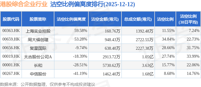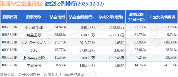 从沽空比例偏离度来看,上海实业控股、周大福创建、复星国际沽空比例偏离度位居行业前三,分别为59.58%、53.28%、-9.74%。
