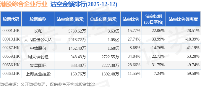 证券之星消息,12月12日港交所披露数据显示,当日港股综合企业行业的22只个股中有6只被沽空,总沽空股数为535.55万股,总沽空金额为1.19亿元(港元),而当日综合企业行业的总成交金额为7.18亿元(港元),沽空比例为16.51%。当日综合企业行业总体涨1.68%。