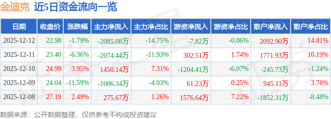 证券之星消息,截至2025年12月12日收盘,金迪克(688670)报收于22.98元,下跌1.79%,换手率4.98%,成交量6.14万手,成交额1.41亿元。
