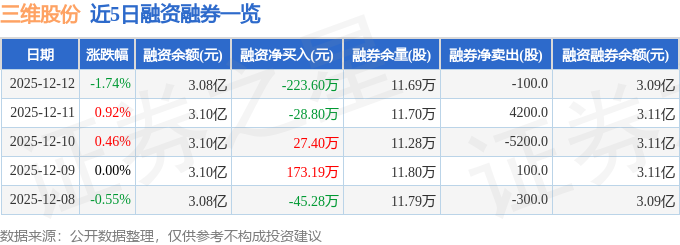 三维股份融资融券信息显示,融资方面,当日融资买入474.78万元,融资偿还698.39万元,融资净偿还223.6万元。融券方面,融券卖出2100.0股,融券偿还2200.0股,融券余量11.69万股,融券余额125.67万元。融资融券余额3.09亿元。