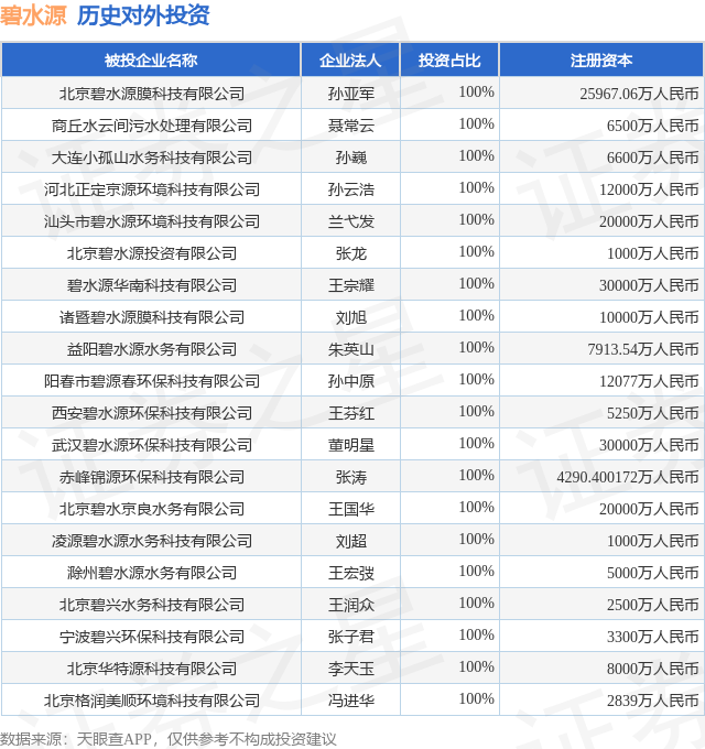 通过天眼查大数据分析,北京碧水源科技股份有限公司共对外投资了319家企业,参与招投标项目2227次;财产线索方面有商标信息139条,专利信息111条,著作权信息14条;此外企业还拥有行政许可34个。据2024年报数据,碧水源商誉5.87亿元,同比减8.52%。长期股权投资52.03亿元,同比减6.44%。