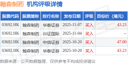 截至2025年12月16日收盘,翰森制药(03692.HK)报收于39.14港元,下跌1.51%,成交量769.2万股,成交额3.0亿港元。投行对该股的评级以买入为主,近90天内共有4家投行给出买入评级,近90天的目标均价为44.49港元。华泰证券最新一份研报给予翰森制药买入评级,目标价43.23港元。