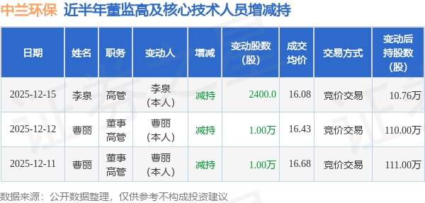 证券之星消息,根据12月16日市场公开信息、上市公司公告及交易所披露数据整理,中兰环保(300854)最新董监高及相关人员股份变动情况:2025年12月15日公司高管李泉共减持公司股份2400.0股,占公司总股本为0.0024%。变动期间公司股价上涨0.69%,12月15日当日收盘报16.1元。