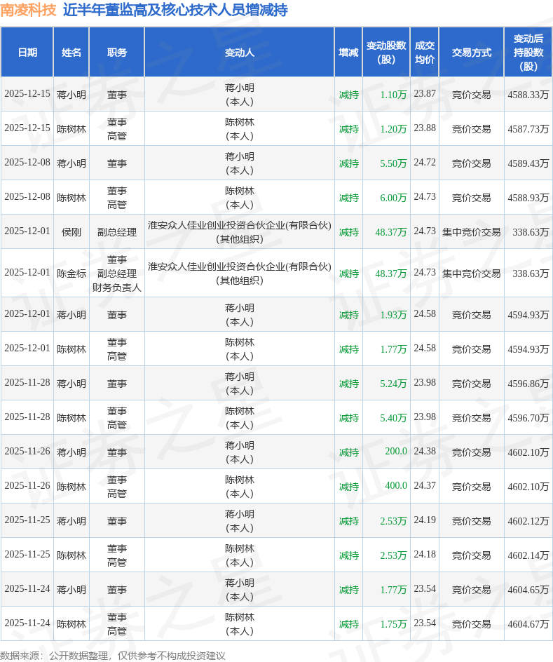 南凌科技近半年内的董监高及核心技术人员增减持详情如下: