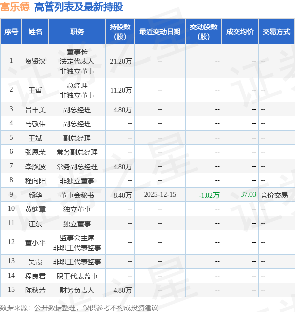证券之星消息,根据12月16日市场公开信息、上市公司公告及交易所披露数据整理,富乐德(301297)最新董监高及相关人员股份变动情况:2025年12月15日公司董秘颜华共减持公司股份1.02万股,占公司总股本为0.0014%。变动期间公司股价下跌1.41%,12月15日当日收盘报37.04元。