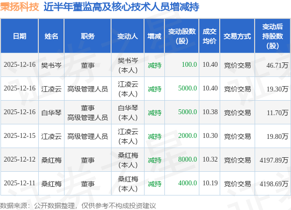 证券之星消息,根据12月17日市场公开信息、上市公司公告及交易所披露数据整理,秉扬科技(920675)最新董监高及相关人员股份变动情况:2025年12月15日至2025年12月16日公司高级管理人员江凌云、董事樊书岑、董事,高级管理人员白华琴共减持公司股份1.21万股,占公司总股本为0.0071%。变动期间公司股价上涨1.67%,12月16日当日收盘报10.37元。