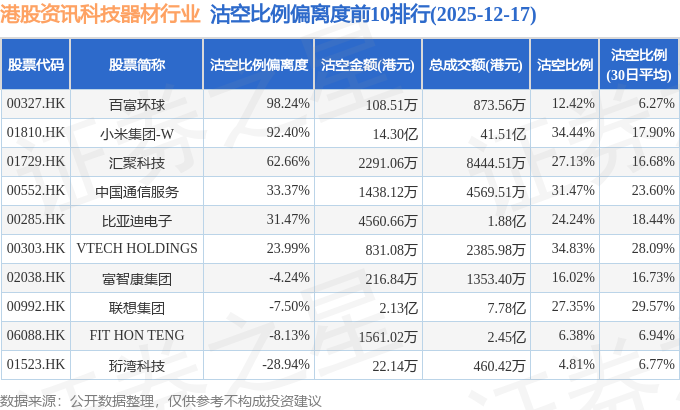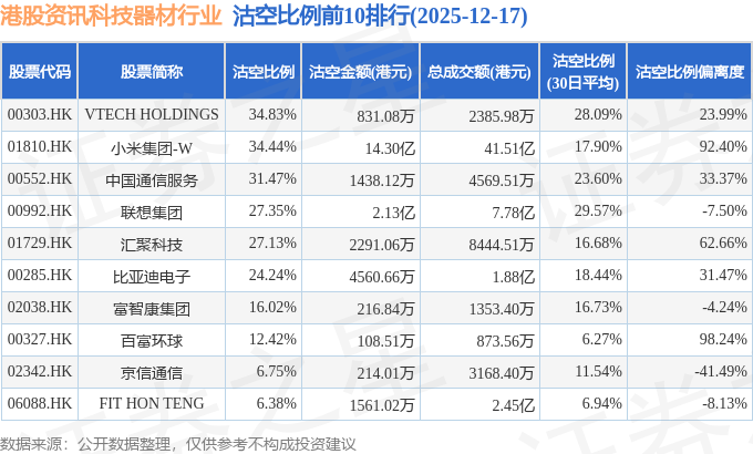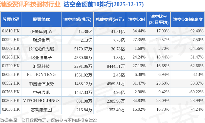 12月17日港股资讯科技器材行业沽空数据盘点,小米集团-W、联想集团、长飞光纤光缆沽空金额位居行业前三