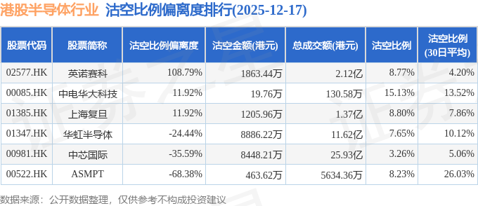 从沽空比例偏离度来看,英诺赛科、中电华大科技、上海复旦沽空比例偏离度位居行业前三,分别为108.79%、11.92%、11.92%。
