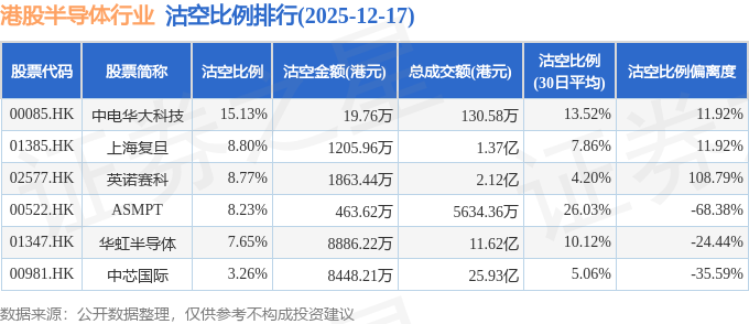 从沽空比例来看,中电华大科技、上海复旦、英诺赛科沽空比例位居行业前三,分别为15.13%、8.8%、8.77%。