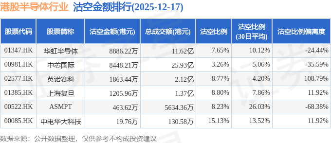 从沽空金额来看,华虹半导体、中芯国际、英诺赛科沽空金额位居行业前三,分别为8886.22万港元、8448.21万港元、1863.44万港元。