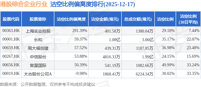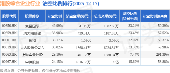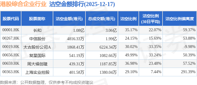 12月17日港股综合企业行业沽空数据盘点,长和、中信股份、太古股份公司A沽空金额位居行业前三