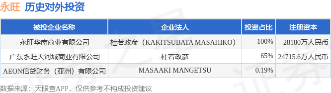 证券之星消息,根据天眼查APP显示,永旺(00984.HK)新增一起对外投资事件,被投资公司为AEON信贷财务(亚洲)有限公司,法定代表人MASAAKI MANGETSU,投资占比为0.19%。该公司从事,注册资本为。目前,永旺共存在对外投资3项,详见下表:
