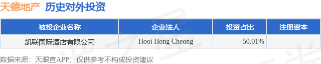 证券之星消息,根据天眼查APP显示,天德地产(00266.HK)新增一起对外投资事件,被投资公司为凯联国际酒店有限公司,法定代表人Hooi Hong Cheong,投资占比为50.01%。该公司从事,注册资本为。目前,天德地产共存在对外投资1项,详见下表: