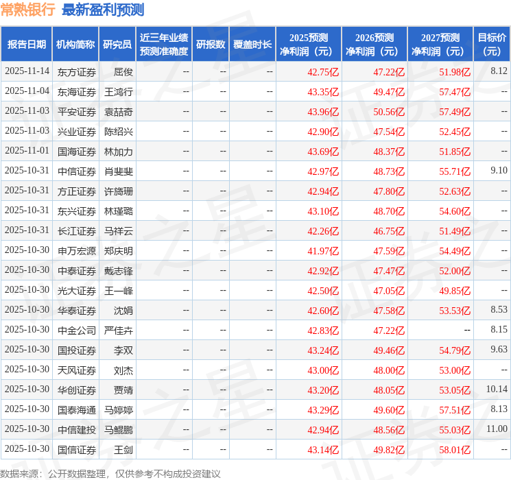证券之星消息,2025年12月17日常熟银行(601128)发布公告称公司于2025年12月16日接受机构调研,兴业证券、招商基金、中庚基金、信达澳业基金、其他3家机构参与。