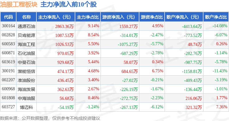 从资金流向上来看,当日油服工程板块主力资金净流入6668.78万元,游资资金净流出197.75万元,散户资金净流出6471.03万元。油服工程板块个股资金流向见下表: