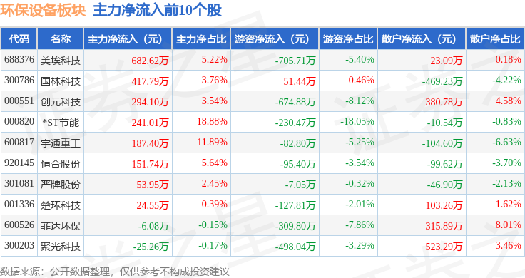 从资金流向上来看,当日环保设备板块主力资金净流出2.78亿元,游资资金净流入7362.65万元,散户资金净流入2.05亿元。环保设备板块个股资金流向见下表: