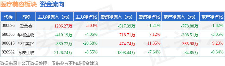 从资金流向上来看,当日医疗美容板块主力资金净流入25.35万元,游资资金净流入676.06万元,散户资金净流出701.41万元。医疗美容板块个股资金流向见下表: