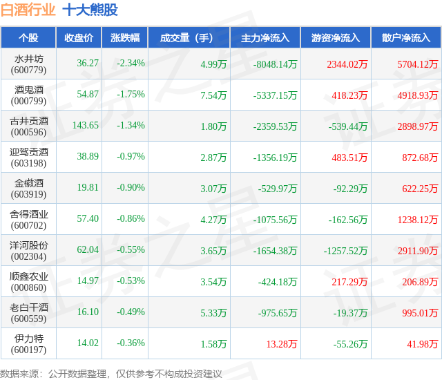 个股表现方面,白酒行业当日领跌股为水井坊(600779),该股当日报收36.27,下跌2.34%,成交量4.99万,主力资金净流出8048.14万元。酒鬼酒(000799)以下跌1.75%紧随其后,该股当日成交量7.54万,主力资金净流出5337.15万元。除此之外,古井贡酒(000596)、迎驾贡酒(603198)、金徽酒(603919)均进入当日熊股之列。具体个股列表见下表: