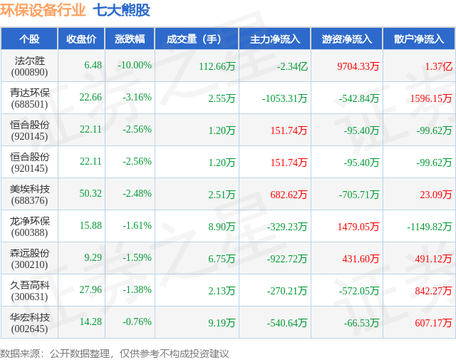 个股表现方面,环保设备行业当日领跌股为法尔胜(000890),该股当日报收6.48,下跌10.0%,成交量112.66万,主力资金净流出2.34亿元。青达环保(688501)以下跌3.16%紧随其后,该股当日成交量2.55万,主力资金净流出1053.31万元。除此之外,恒合股份(920145)、恒合股份(920145)、美埃科技(688376)均进入当日熊股之列。具体个股列表见下表: