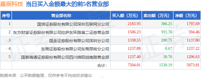证券之星消息,沪深交易所2025年12月18日公布的交易公开信息显示,星辰科技(920885)因当日换手率达到20%的前5只股票,当日收盘价涨幅达到20%的前5只股票登上龙虎榜。此次是近5个交易日内第1次上榜。