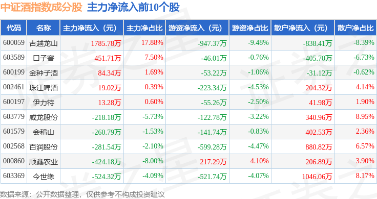 资金流向方面,中证酒(399987)指数成份股当日主力资金净流出合计5.55亿元,游资资金净流入合计8010.81万元,散户资金净流入合计4.75亿元。成份股资金流向详情见下表: