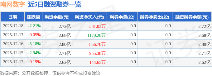 南网数字融资融券信息显示,融资方面,当日融资买入3294.91万元,融资偿还2913.88万元,融资净买入381.03万元。融券方面,融券卖出0.0股,融券偿还0.0股,融券余量0.0股,融券余额0.0万元。融资融券余额2.72亿元。