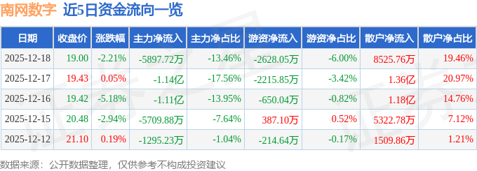 证券之星消息,截至2025年12月18日收盘,南网数字(301638)报收于19.0元,下跌2.21%,换手率9.74%,成交量22.88万手,成交额4.38亿元。