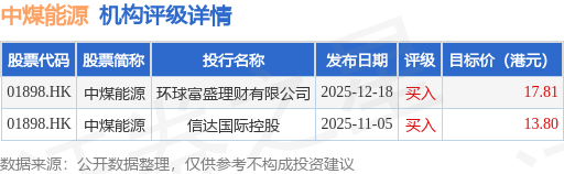 投行对该股的评级以买入为主,近90天内共有2家投行给出买入评级,近90天的目标均价为15.8港元。环球富盛理财有限公司最新一份研报给予中煤能源买入评级,目标价17.81港元。