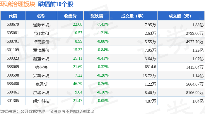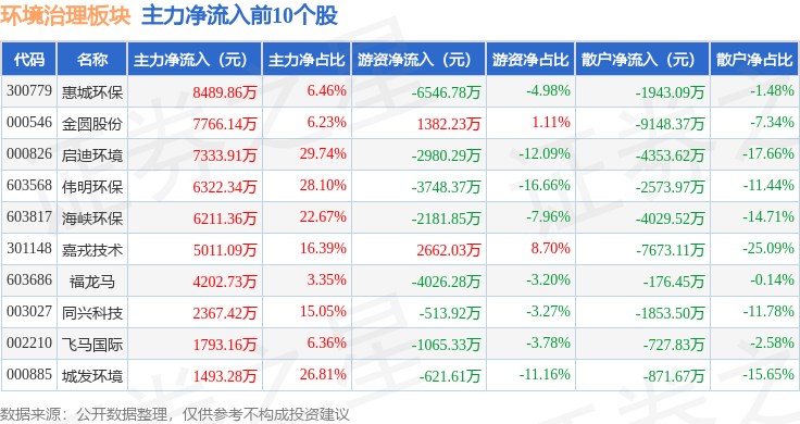 从资金流向上来看,当日环境治理板块主力资金净流入2.83亿元,游资资金净流出3.01亿元,散户资金净流入1845.77万元。环境治理板块个股资金流向见下表: