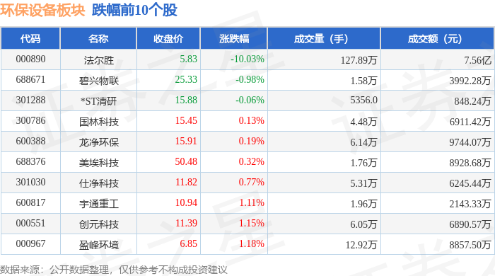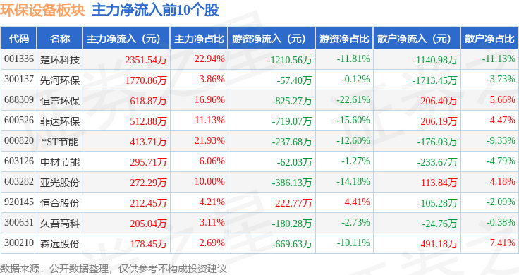 从资金流向上来看,当日环保设备板块主力资金净流出1.0亿元,游资资金净流出2832.56万元,散户资金净流入1.29亿元。环保设备板块个股资金流向见下表: