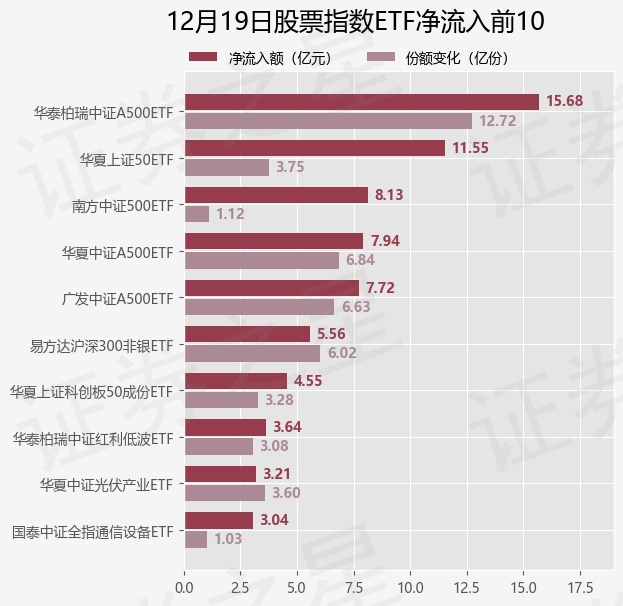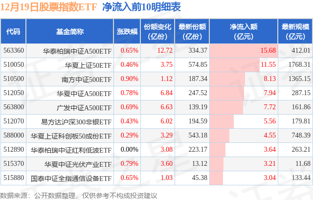 当日有164只股票指数ETF基金出现资金净流入,其中净流入排首位的是华泰柏瑞中证A500ETF(563360),份额增加了12.72亿份,净流入额为15.68亿元。