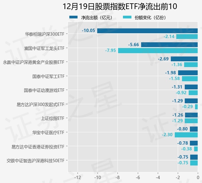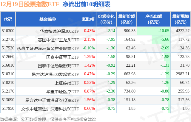 当日有194只股票指数ETF基金出现资金净流出,其中净流出排首位的是华泰柏瑞沪深300ETF(510300),份额减少了2.14亿份,净流出额为10.05亿元。