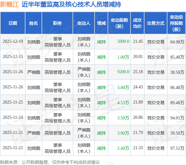 新赣江近半年内的董监高及核心技术人员增减持详情如下: