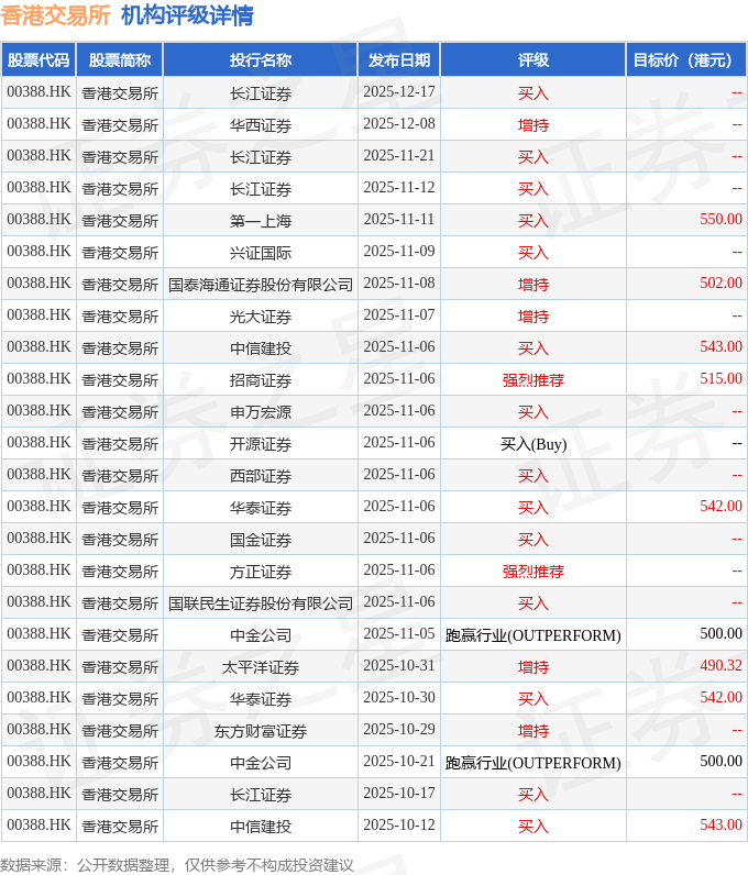 投行对该股的评级以买入为主,近90天内共有14家投行给出买入评级,近90天的目标均价为522.73港元。长江证券最新一份研报给予香港交易所买入评级。
