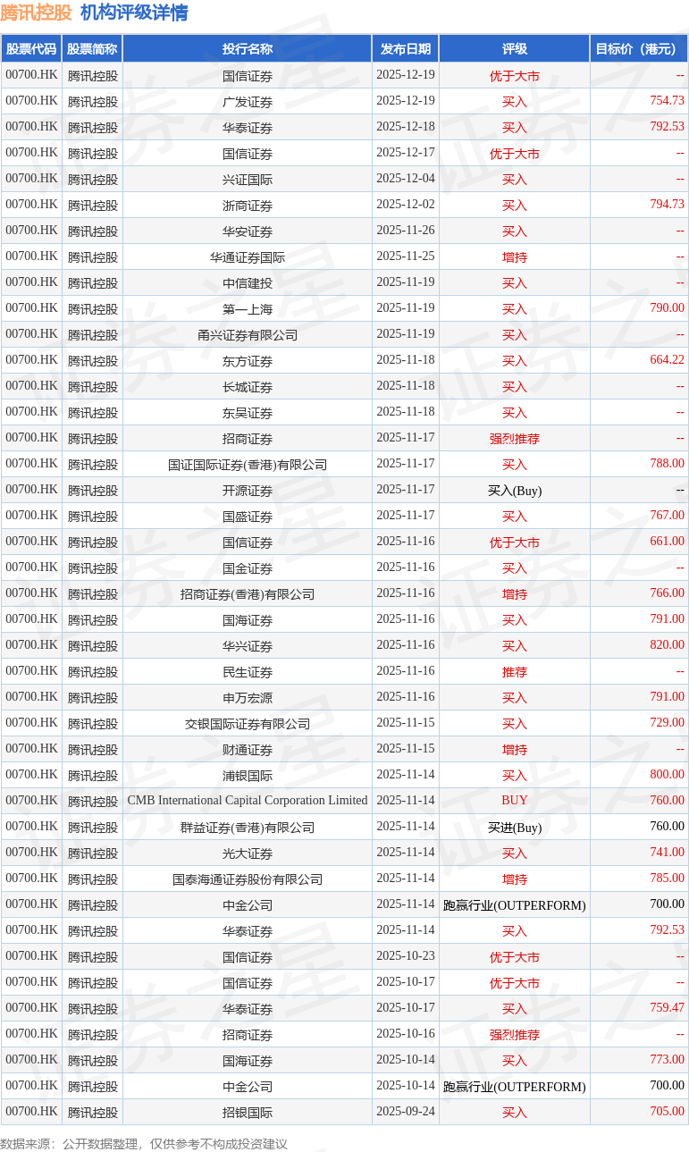 截至2025年12月22日收盘,腾讯控股(00700.HK)报收于614.5港元,上涨0.08%,成交量1386.81万股,成交额85.2亿港元。投行对该股的评级以买入为主,近90天内共有24家投行给出买入评级,近90天的目标均价为757.72港元。国信证券最新一份研报给予腾讯控股优于大市评级。