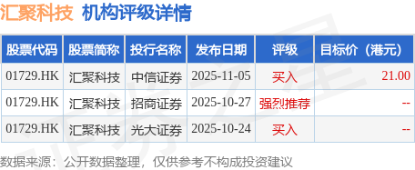 截至2025年12月22日收盘,汇聚科技(01729.HK)报收于18.45港元,上涨13.19%,成交量2984.14万股,成交额5.46亿港元。投行对该股的评级以买入为主,近90天内共有2家投行给出买入评级,近90天的目标均价为21港元。中信证券最新一份研报给予汇聚科技买入评级,目标价21港元。