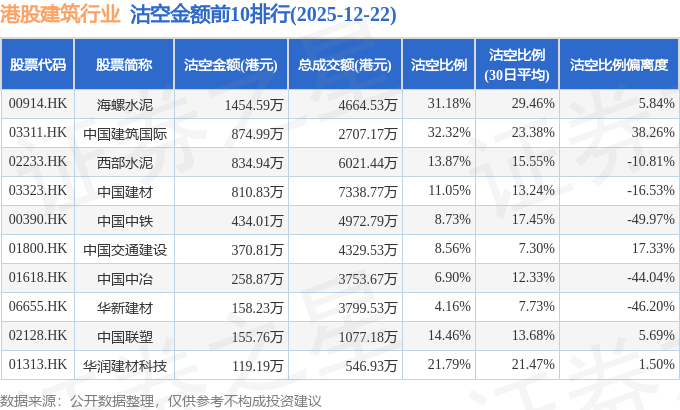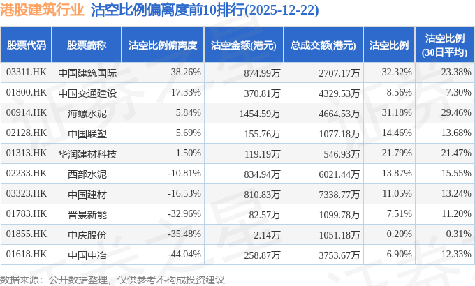 从沽空比例偏离度来看,中国建筑国际、中国交通建设、海螺水泥沽空比例偏离度位居行业前三,分别为38.26%、17.33%、5.84%。