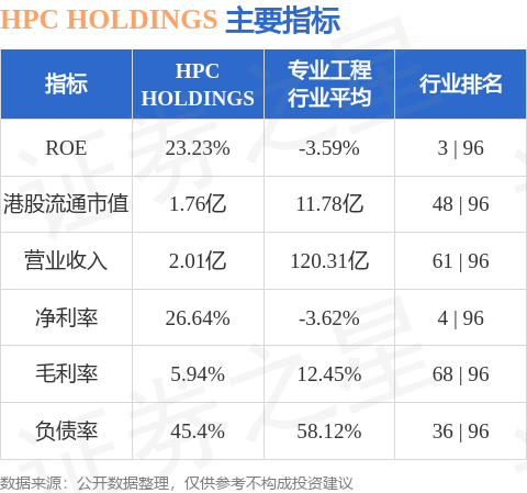 HPC HOLDINGS港股市值1.76亿港元,在专业工程行业中排名第48。主要指标见下表: