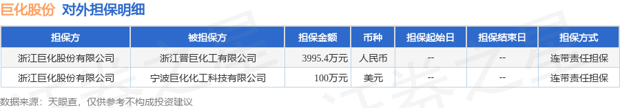 巨化股份12月22日披露2笔对外担保,被担保公司2家。对外担保明细如下表: