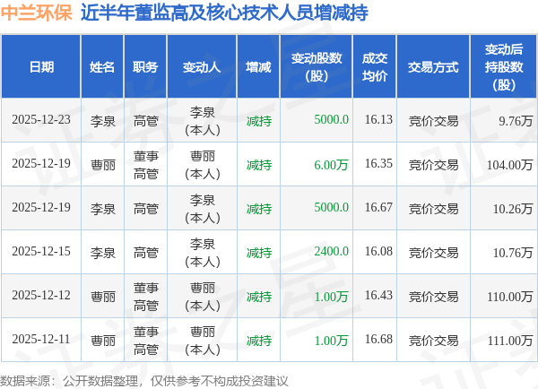 中兰环保近半年内的董监高及核心技术人员增减持详情如下: