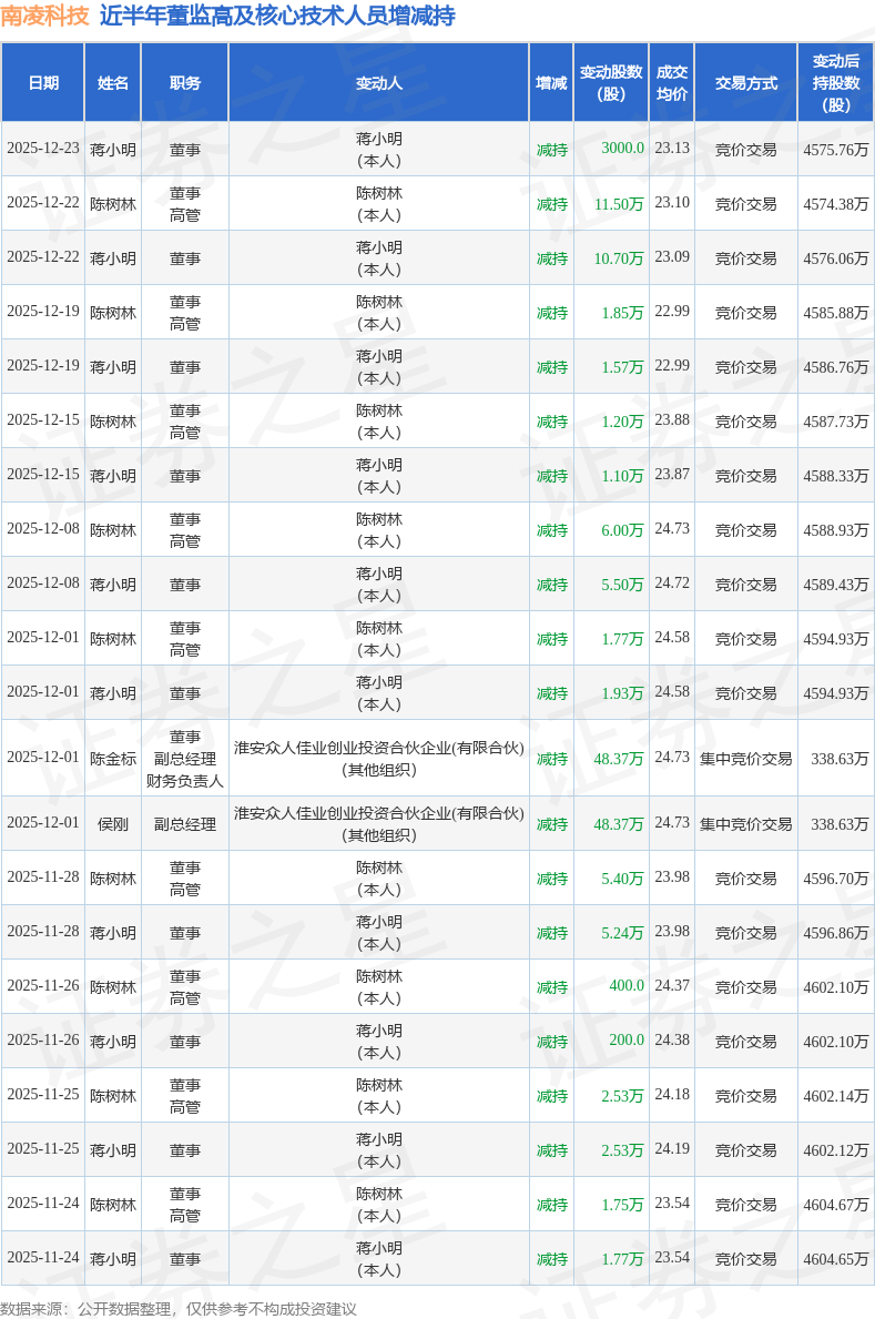 南凌科技近半年内的董监高及核心技术人员增减持详情如下:
