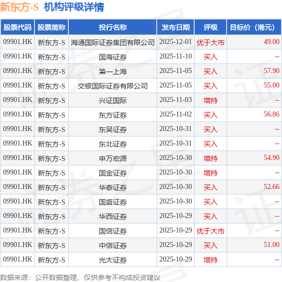 投行对该股的评级以买入为主,近90天内共有10家投行给出买入评级,近90天的目标均价为53.9港元。海通国际证券集团有限公司最新一份研报给予新东方-S优于大市评级,目标价49港元。