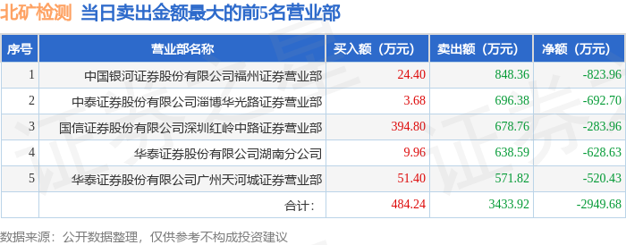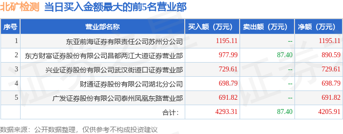 证券之星消息,沪深交易所2025年12月26日公布的交易公开信息显示,北矿检测(920160)因当日换手率达到20%的前5只股票,当日价格振幅达到30%的前5只股票登上龙虎榜。此次是近5个交易日内第1次上榜。