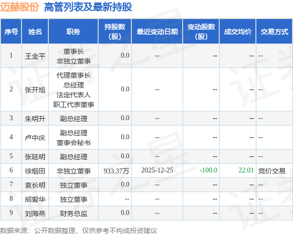 迈赫股份的高管列表及最新持股情况如下: